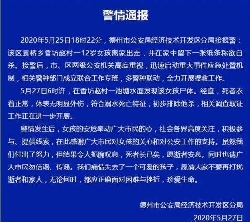 山东12岁女孩留下“妈妈,我去跳海自杀了”的纸条后离家出走。当2天后发现时真的溺水身亡了。尸体是27号(今天早上)六点多发现的。经过警方查明,正是此前离家出走的女孩。通过伤情鉴定,外表没有明显外伤,符合溺水死亡的特征,初步排除他人作案的可能,具体的情况还在进一步的调查当中。