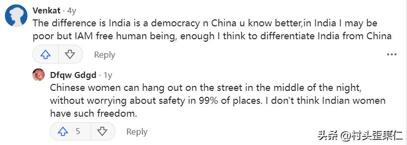 紧接着,印度网友Venkat说印度是民主国家,可能我在印度会很穷,但是我们很自由,我认为这一优势足以让印度和中国拉开差距。