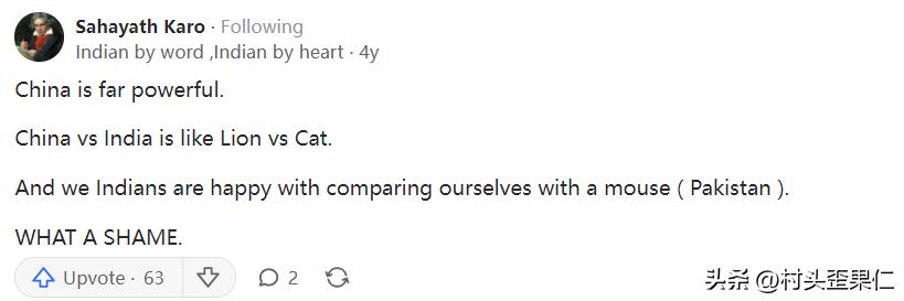 先来看一个比较简短的回答,来自印度网友Sahayath Karo。他说,其实中国远比我们想象的要强大,中国对比印度就像狮子对比小猫咪,而我们印度人却总喜欢拿自己和小老鼠(巴基斯坦)对比,我都觉得丢脸。