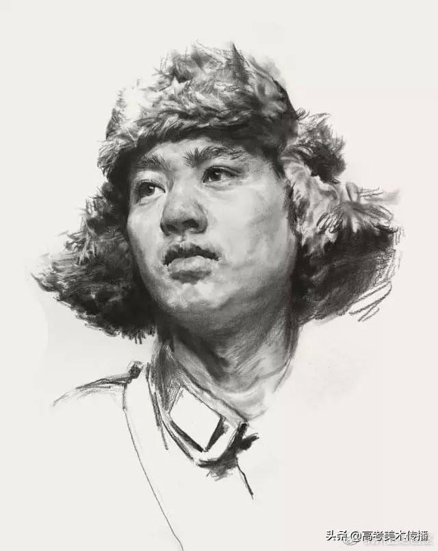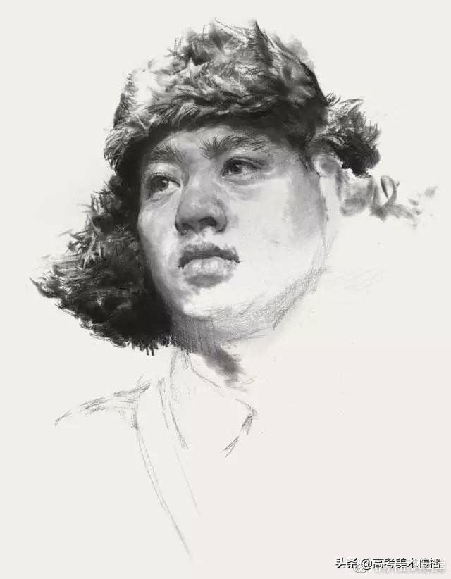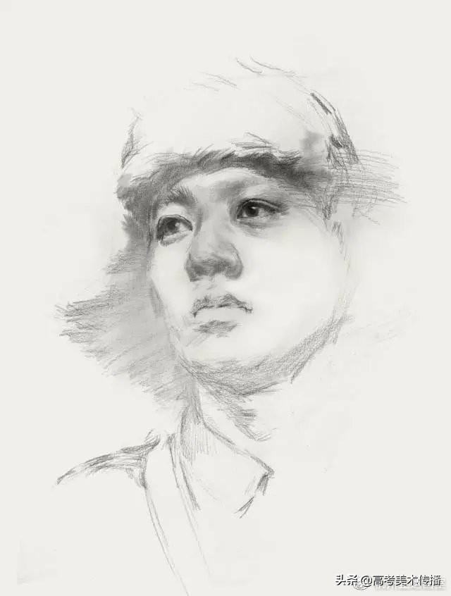 这位模特戴了厚重的帽子,遮挡了全部的头发,这帽子就相当于头发,只不过是蓬松乱且并不柔顺的头发,不论是头发还是帽子,只要是面部外的元素都应当是衬托的作用,作者将帽子画的很重,很好的衬托了面部。