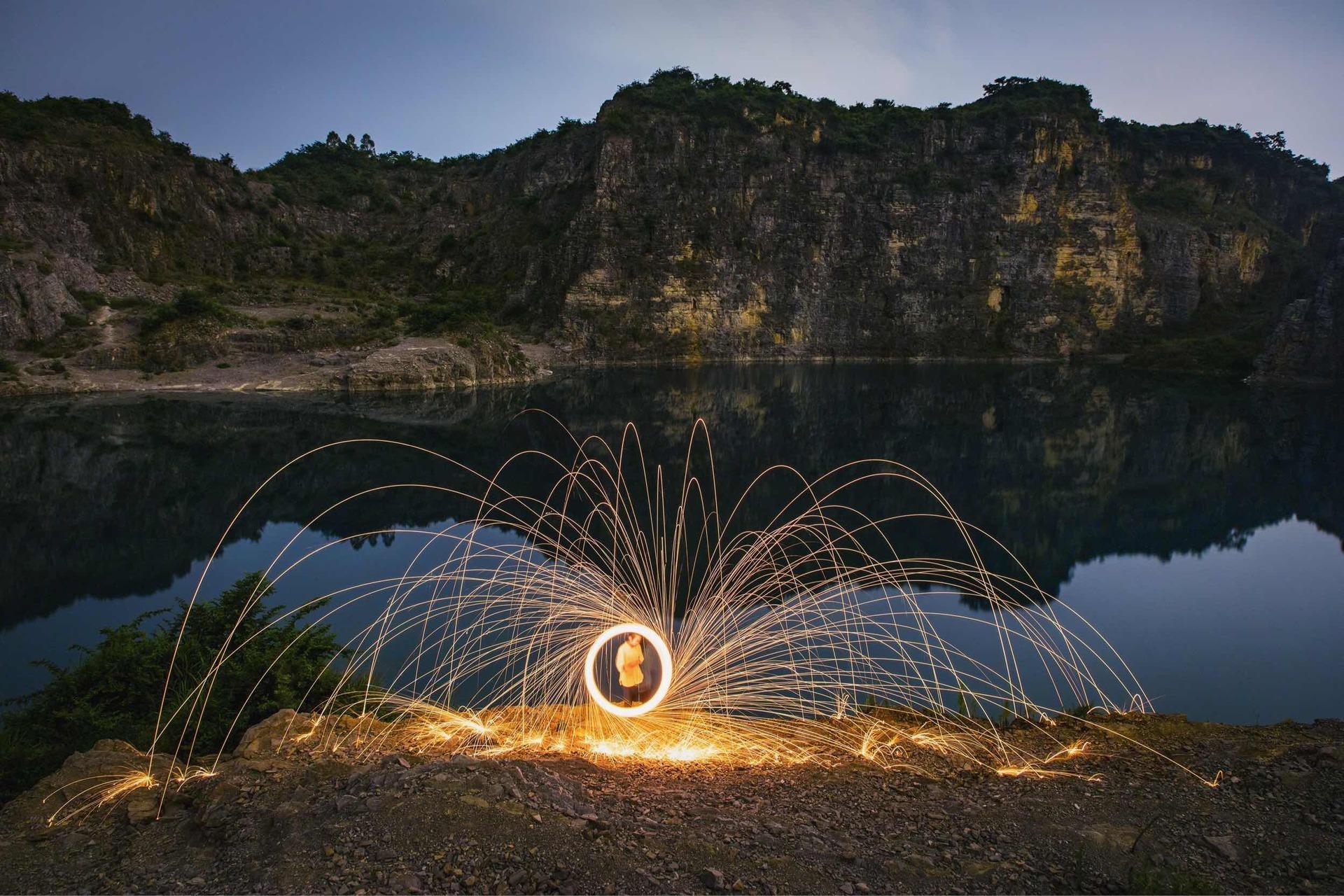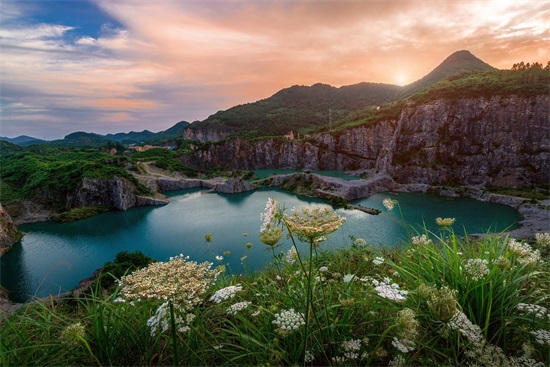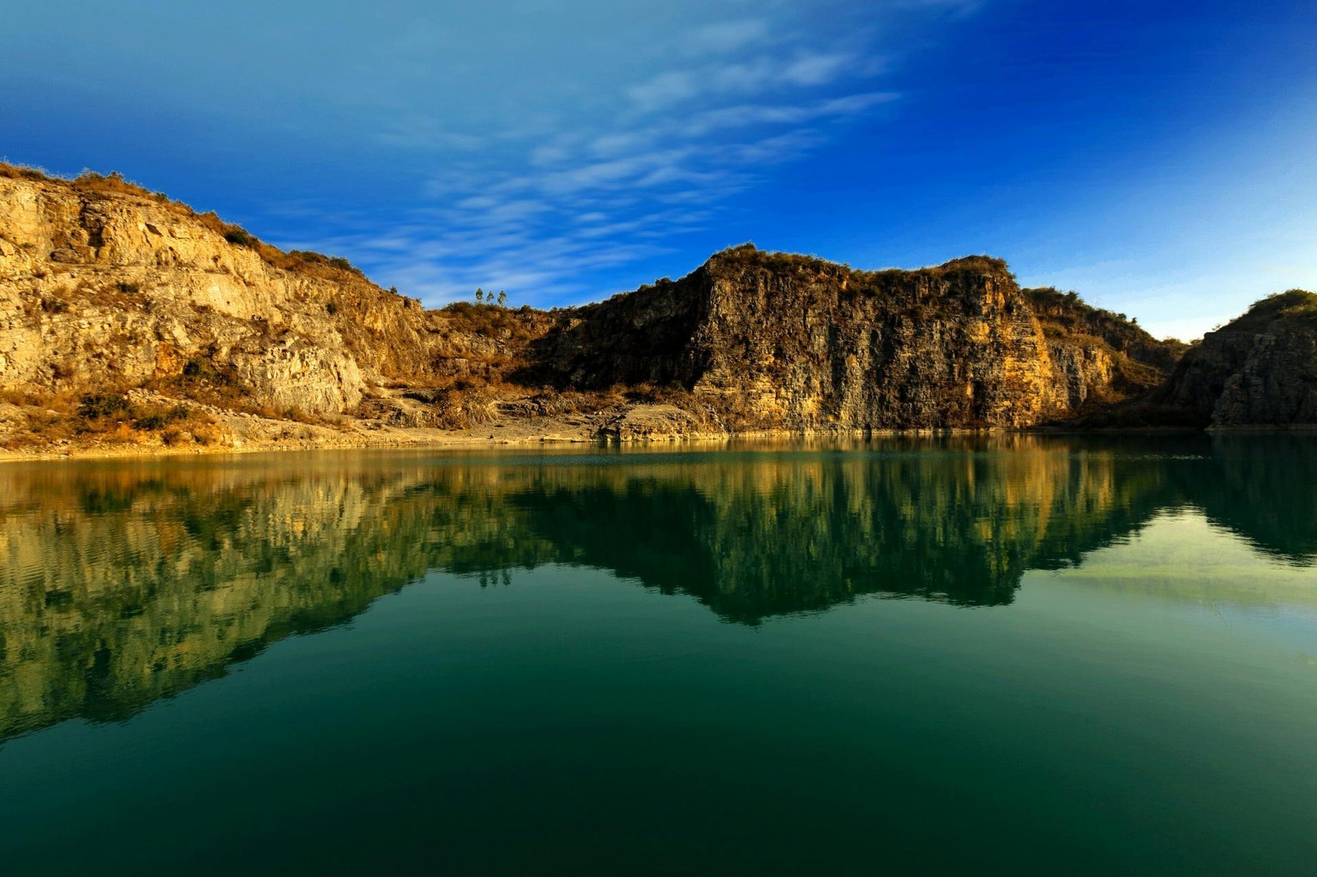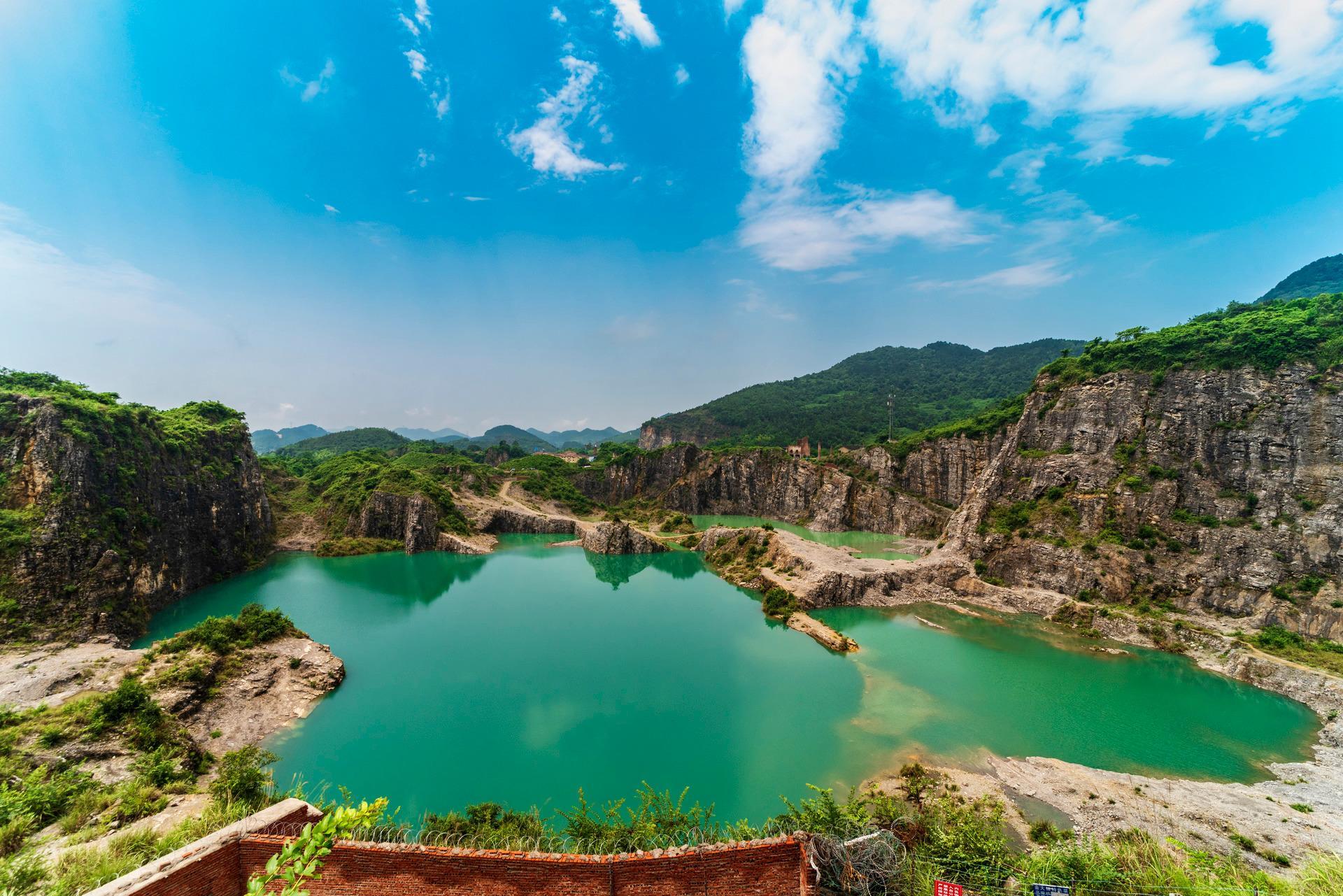 上世纪七十年代,这里是采石场,加工碎石,后来逐渐被废弃,遗留下大大小小、深浅不一的矿坑。在矿坑边有废弃的房子、汽车、机械设备,默默地述说它的过去。机声隆隆,尘土飞扬的几十年后,这里突然安静下来,一切都变成废物、废墟、遗址。鸟能飞越,人却不来了。谁也没有预见到,后来的日子,雨水在坑中汇集,由于矿坑积水长时期对岩石的溶解作用,水的颜色渐渐变成了翡翠色、湛蓝色,造就了碧水、峭壁、深潭的奇妙景色。昔日满目疮痍的矿坑,蜕变为独具特色的坑塘湖,采石场成了矿山公园。