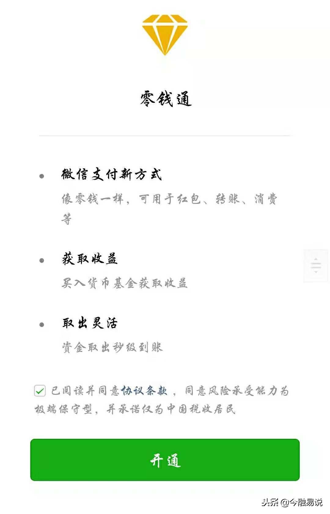零钱通是与微信“零钱”并列的支付基础服务账户,微信用户可按照【微信】-【钱包】-【零钱】-【零钱通】的路径便可以直接进入开通该功能,实现理财收益。