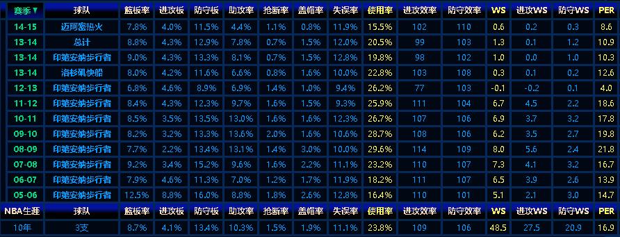 而在高阶数据方面,格兰杰生涯的使用率为23.8%,而最高的一年是08—09赛季的29.8%;进攻效率和防守效率分别为109、106,可以看出其攻防两端都起到了不错的作用;生涯平均PER值为16.9,最高的是08—09赛季的21.8,也是唯一一次破20的。可以说,格兰杰的生涯里用并不太多的球权,给球队带来了不错的赛场表现,如果除去12年以后,其实他的表现是更加优秀的。而无论在各方面考量,08—09赛季都是他最好的一个赛季,在这个时期,格兰杰是东部真正意义上的第三小前锋,前两位是詹姆斯和皮尔斯。