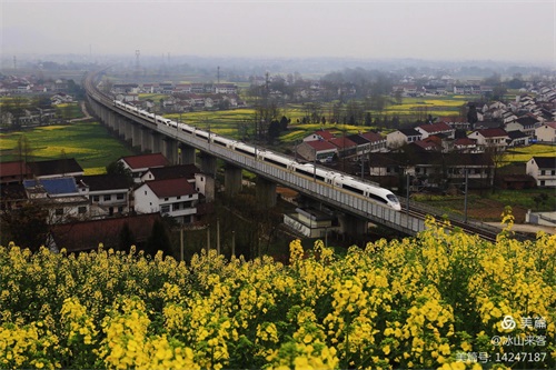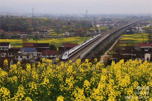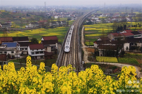 南郑区新集镇的岳家岭村的油菜花海,这里是西成高铁的隧道入口,爬到高铁隧道的上方,只见一条长长的略带弯曲的铁路线延伸过来,在铁路线的两边是村庄和金黄的油菜花海,不时有高铁飞驰而过,这时你找好角度,按下快门,一张列车在花海中飞驰的壮观场景便被记录下来,我们称它是开往春天的列车。