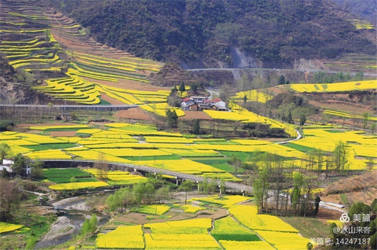 当汉中平原上的油菜花海已经接近尾声,往日的金黄色已经渐渐退去,绿色已经开始登场,油菜花海也变成了黄中带绿,绿中透黄,黄绿相间的模样,这时,位于略阳县徐家坪至西淮坝村之间的油菜花海正在盛开,当你来到这条线路,就会欣赏到最美的梯田油菜花海,感受它的独特魅力。