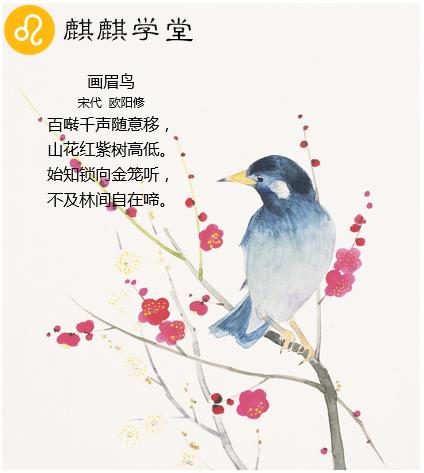 《画眉鸟》是北宋文学家欧阳修在晚年曾经多次提出辞官,但均未获得允许时创作的一首七言绝句。特作此诗以表达自己久居庙堂、羁鸟念林的愿望,但是多少表现出一点政治上失意的忧郁心情。此诗前两句写景,景中寓理;后两句言理,情理兼融。表现出诗人对禁锢人才的憎恶与否定、对自由生活的热爱与向往。这首诗情景结合,寓意深远。