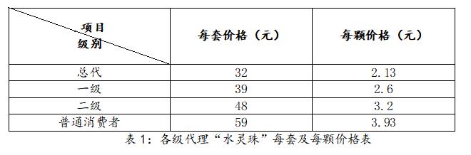 一套“水灵珠”=大盒(8g*12颗)+小盒(4g*6颗),售价59元,相当于8g的“水灵珠”15颗,平均售价每颗3.93元。如果各级代理拿了货自己用,一颗折合多少钱呢?如表1:各级代理“水灵珠”每套及每颗价格表。