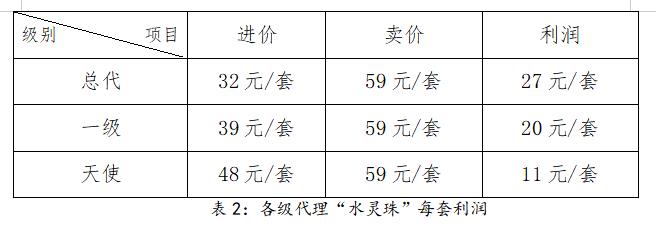 第一种情况,将产品直接卖给消费者,各级代理每套“水灵珠”分别能赚多少钱?见下表2:各级代理“水灵珠”每套利润。