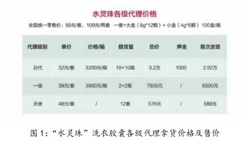 但凡有点儿常识的人都会懂得一个道理,那就是买东西就要挑“质优价廉”的,选择一个产品时人们最关注的就是产品的质量和价格。关于洗衣效果,经过媳妇的亲身验证,效果确实不错,女儿衣服上的油污和颜料都能洗净。至于对其他污渍的效果,这里就不作研究了,又不是给它做广告的。下面主要分析一下这款洗衣胶囊的价格。如图1:“水灵珠”洗衣胶囊各级代理拿货价格及售价。