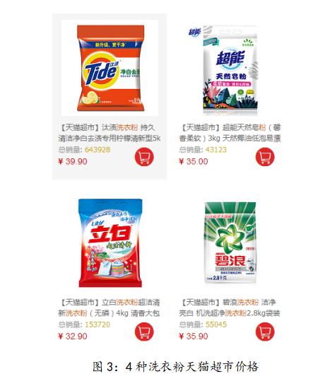 先看一下常用洗衣粉的价格。如图3:4种洗衣粉天猫超市价格。