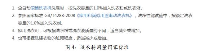 那么日常洗衣,洗衣粉的用量是多少呢?这个其实就不好估计了,个人的洗衣习惯、衣物脏的程度、洗衣机效果等因素都是因人而异的。上网一查,居然有国家洗衣标准,感谢万能的度娘。如图4:洗衣粉用量国家标准,由参照国家标准GB/T4288-2008《家用和类似用途电动洗衣机》,洗净性能试验中,按额定洗衣容量的1.0%加入洗涤剂。那么洗5公斤的衣物,洗衣粉标准用量为50克。用汰渍、超能、立白和碧浪4种洗衣粉分别洗5公斤衣物成本分别为0.4元、0.585元、0.41元和0.64元,平均成本约为0.5元。