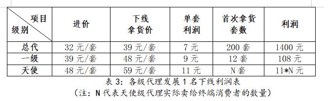 通过表3,可以得出总代每发展一名一级代理可以获利1400元,一名一级代理每发展一名天使代理可以获利108元。再结合表2和表3,能看出什么来?还是深深的套路。一是指望卖一种原本市场潜在需求量就不大的产品,还不如去发展下线来钱快。二是总代发展一名一级代理单套利润虽然只有7元,但利润总额却最大。三是不管你能不能卖出去,反正货已经压在你手里了,钱已经层层剥皮后到了顶端了,不要忘了,货币也有时间价值。四能否退货问题。首先基于这种代理和剥皮的模式,退货肯定很难的,要不然你的上级代理岂不是白被上级剥皮了?假使真能退货,你的上级代理只能更加努力的去寻找新的代理来重新消化退回的货,对“水灵珠”的运营团队而言是很好的激励手段。这像是什么?靠发展下线来谋取利益,不就是变相的传销吗。
