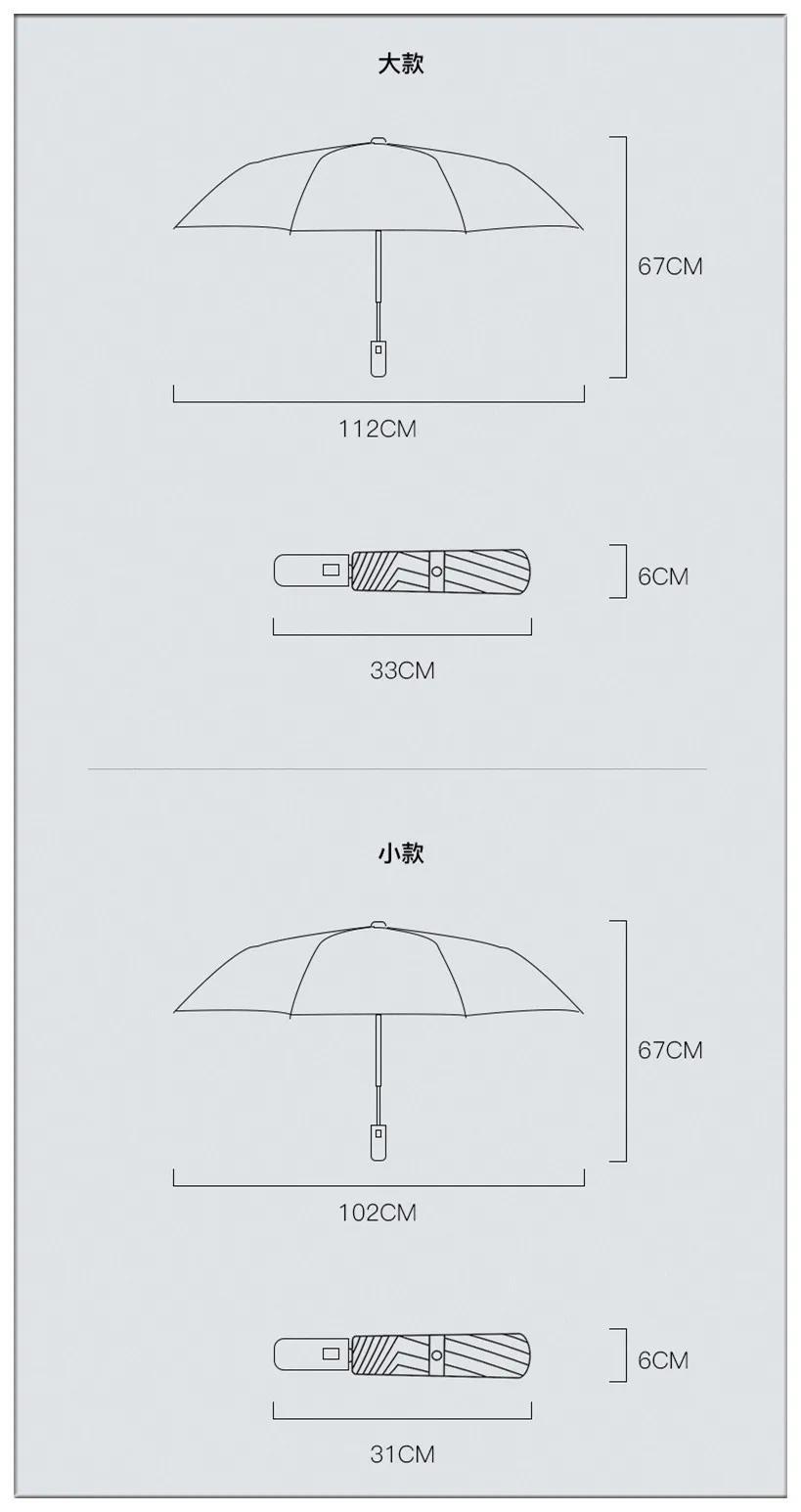 大款伞面撑开后为 112cm ,小款撑开后也有 102cm 。