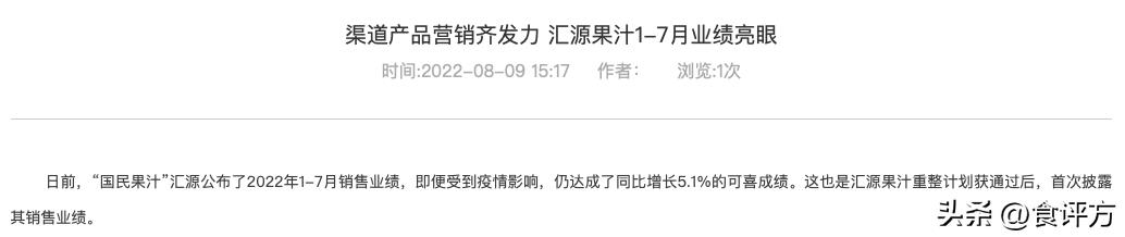 今年8月9日,汇源果汁通过官网披露了今年1-7月销售业绩,并声称:“即便受到疫情影响,扔达成了同比增长5.1%的可喜成绩。这也是汇源果汁重整计划获通过后,首次披露其销售业绩。”
