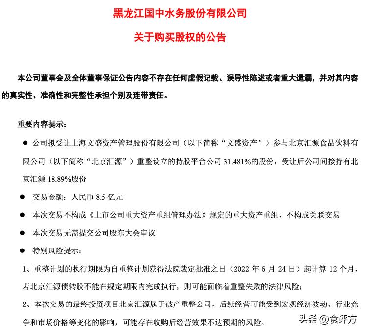 12月27日,国中水务发布《关于购买股权的公告》,公司拟受让文盛资产参与北京汇源重整设立的持股平台即诸暨市文盛汇自有资金投资有限公司(下称“文盛汇”)31.481%的股份。文盛汇只认购重整后的北京汇源60%股权,不做其他经营业务,转让后国中水务间接持有北京汇源18.89%股份。