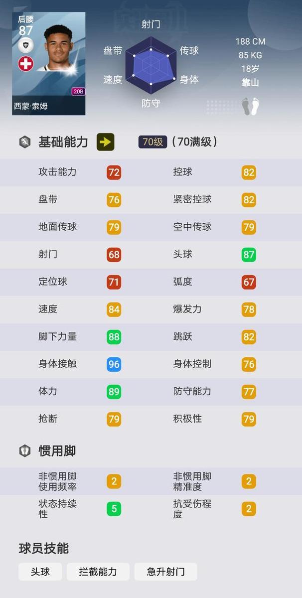 小将索姆在20A中只是一个无人问津的假脸球员,在20B中迎来了有质的提升,也成为了白球后腰中的佼佼者。身高188的他没有图兰高,却足足比图兰重了将近20斤,这也让他的身体素质更加出色,满级后拥有高达96的身体接触。尽管抢断能力和防守能力不足80,但搭配自带的拦截能力,在防守端还是能达到合格水准。不过综合性价比并不如图兰,作为图兰的替补倒是一个不错的选择。