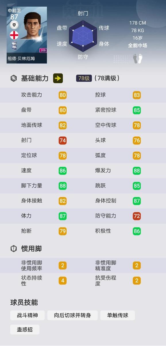 贝林厄姆效力于英冠球队伯明翰,年仅16岁的他已经成为了转会市场炙手可热的香饽饽。其中曼联和多特可能会展开激烈的竞争。现实中的他本赛季表现出色,已经成为了伯明翰的主力,踢球风格类似于b2b中场,覆盖能力出色,同时跑动距离和防守水平也比较突出。而游戏中的他在20B中也迎来了爆发。观察他的游戏数据,不难发现他不同于奥希什,组织能力一般,更突出在全面性,体力充沛的他,具有不错的双速以及勉强合格的双传。作为一个全能六边形战士,十分值得推荐。在未来,我们相信贝林厄姆也会迎来明显的成长。