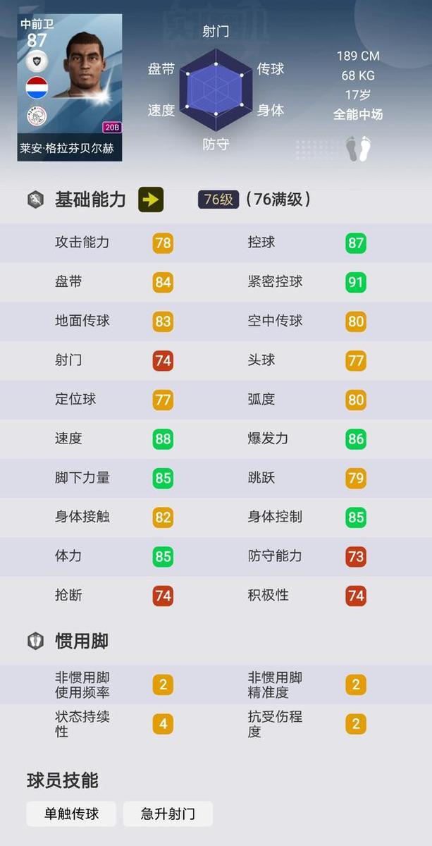 又是出自贾府,又是一个不折不扣的妖人,阿贾克斯作为欧洲知名造星工厂,挖掘培养了众多优秀球员。现实中的他,尽管年仅17岁,但身高已经达到了189cm,据悉尤文有意这名妖人中场。游戏中的他,和贝林厄姆同属于全能中场的风格,都是跑动能力出色,覆盖面积广的球员。不过格拉芬贝尔赫具有更高的身高,模型更具优势。而且与贝林厄姆相比,盘控能力更加出色。与此同时,他还有着不错的持球推进能力,速度也十分快,同样是一名优秀的六边形战士,非常推荐!