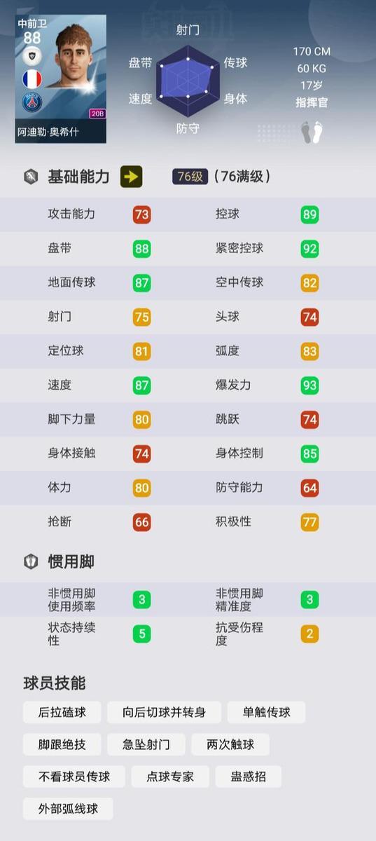 奥希什曾拿下过u17欧洲杯金靴和u17世界杯助攻王,视野出色,经常传出威胁球,同时具有出色的前插能力。作为一个中前卫,就像我们开篇所说,他的控球护球能力以及摆脱防守的能力也非常优秀,但身体素质一般,身体对抗能力略显不足。不过凭借自身的表现,也同样吸引了一些球队的关注。游戏中的他手感不俗,盘控能力极佳,紧密控球高达92,传球也比较精准,作为指挥官的风格,在比赛中能够很好的控制比赛节奏,同时双速也较出色。和现实中相似,游戏中的他身体接触能力较低,但毫不影响他成为一个技术型中场。奥希什可以说是必换白球中场之一,强烈推荐!