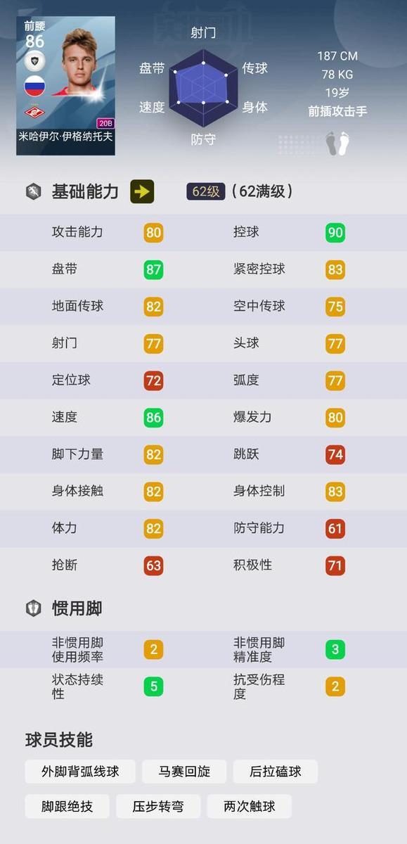 与切尔基同为前插攻击手的风格,但他的身高接近190,拥有更大的模型。满级后盘控分别达到了87和90,同时具有两次触球,压步转弯等较实用的过人技能。作为一个前腰,应该做到能传能射,尽管他的前插能力出色,但射术一般,建议入手后搭配上射门技能,射门水平会有一定提升。