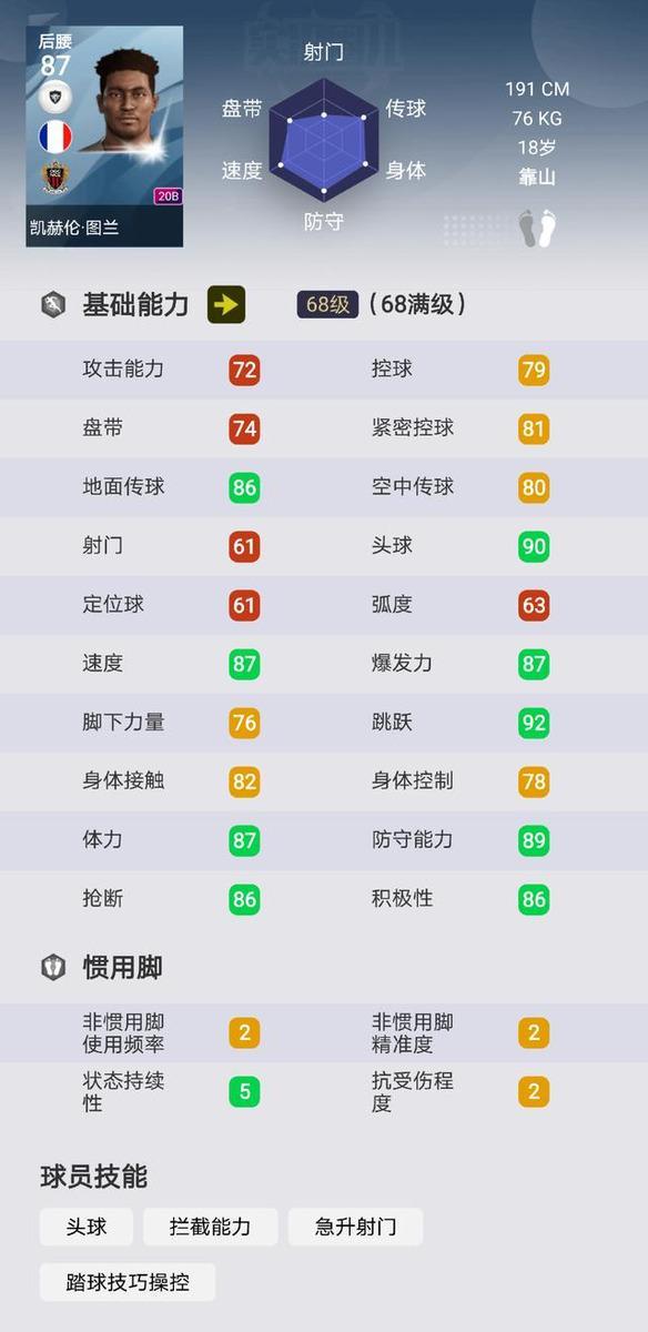年仅18岁的他不仅在游戏中是不折不扣的大妖,而现实中他的同样未来可期,真实身份更是一个星二代,他的父亲正是名宿图拉姆,游戏中的他也被玩家亲切的视为白球维埃拉,身高191的他拥有出色的大模型,搭配靠山风格,同时具有不俗的双传能力和双速,抢断能力和体力也足够他作为首发使用。在sim联赛中,他还具有不错的前插能力,经常前插破门得分,可以说是白球中的第一后腰。要说唯一的缺陷,大概就是如此高的身材,居然只有76kg,这也导致他的身体素质比较一般,不过比起他优秀的防守能力,一个白球你还要什么自行车呢。