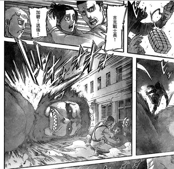 事情的经过只是帅气兵长给了兽巨人漂亮一刀,然后再往脖子的位置扔下了一枚炸弹来宣告吉克的死亡。但是,按照这漫画的一般尿性,没有显示死亡场景的角色其实都是生还着的。