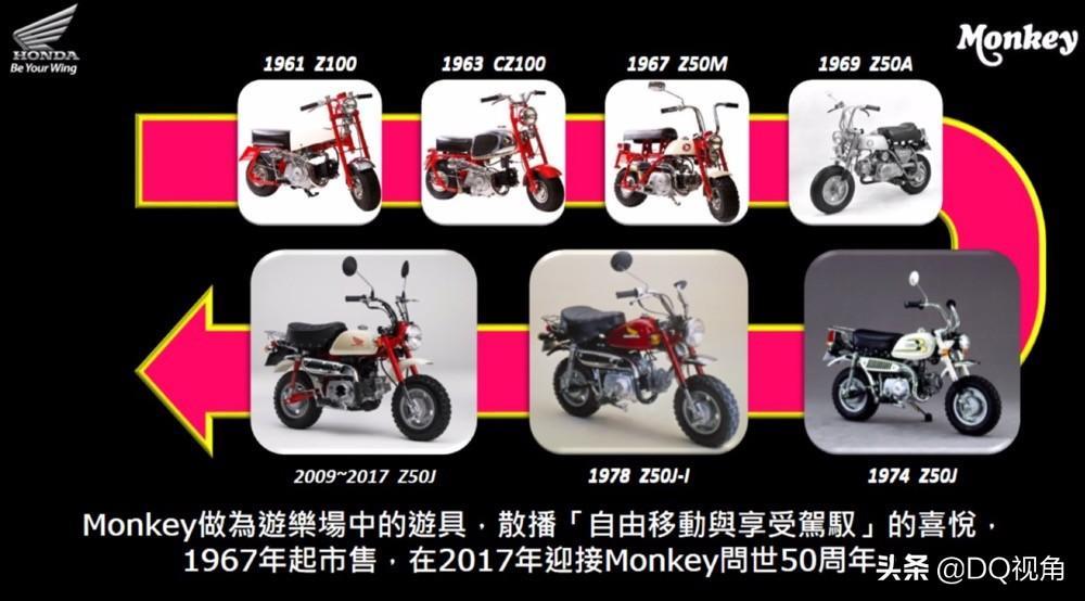 本田猴子这个车型最早可追溯在1961年,当时本田和东京的游乐园合作研发了49.9cc的儿童玩具摩托,由于太受欢迎,这款车在2年后推出了道路版本(第一代只能在游乐场等特定场合,不能在公路上骑行),并且顺势打入了欧洲、美国等市场。经过接近60年的演变,本田猴子的排量也从最初的49cc提高到了125cc,而轮胎尺寸从最早的5英寸提高到了12英寸,而唯一不变是依旧可爱和十足的可玩性。