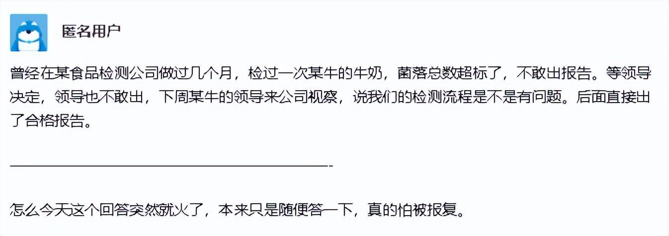 一位在某呼上爆料称:他曾经在某食品检测公司做过几个月,检过一次某牛的牛奶,菌落总数超标了,不敢出报告。等领导决定,领导也不敢出,下周某牛的领导来公司视察,说我们的检测流程是不是有问题。后面直接出了合格报告。
