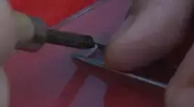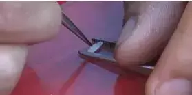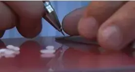 撑开镊子,把米粒夹在镊子中间,把固定好的米粒横向放在桌面上,左手扶住镊子,右手调节米粒的位置,做好刻字前的准备工作。一般是习惯把镊子平放在桌上,把米粒放在镊子稍微靠下的地方,丈量距离时左手拇指和食指压住镊子保持稳定,右手对米粒位置进行微调,以便于找到下刀雕刻的合适角度。