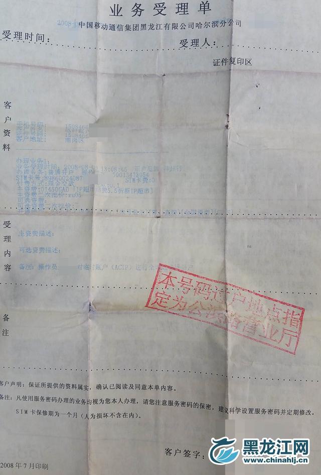 黑龙江网11月28日讯(记者 石启立 王忠岩)近日,哈尔滨市民孙先生反映,他于2008年在中国移动通讯集团哈尔滨分公司公滨路营业厅买了一张移动手机卡,在2018年到公滨路营业厅实名登记时,发现其手机卡已被他人过户并使用。