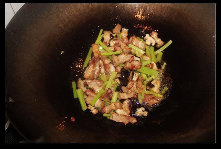 3、接着放芹菜、红菇、蛏干、虾仁、干贝一起翻炒。