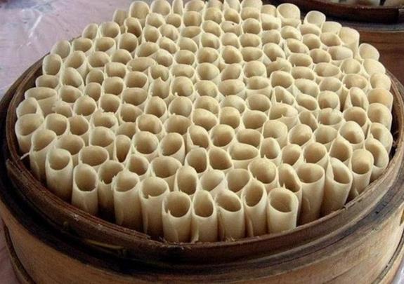 3、正宗的做法是从和好的莜面上揪下一小块面疙瘩,以一手食指为轴心在另一手心中卷搓,就成了这样的卷卷形状的莜面了。菜刀刀背上抹少许油,揪出一小搓面团,在手掌中揉圆,压扁。放在刀背上,用擀面杖橄成牛舌状,顺势卷起来,接口捏死。做的一个个小卷码在屉帘上,蒸锅烧开后,大火蒸10分钟。