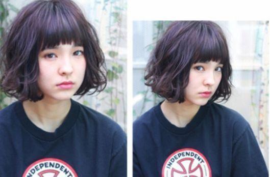 及眉的厚重齐刘海既凸显女生明亮大眼,长及下巴的波波头短发从耳朵上方开始微卷,既遮住了脸上的肉肉又显得非常蓬松可爱,而深紫染发更是时尚个性。