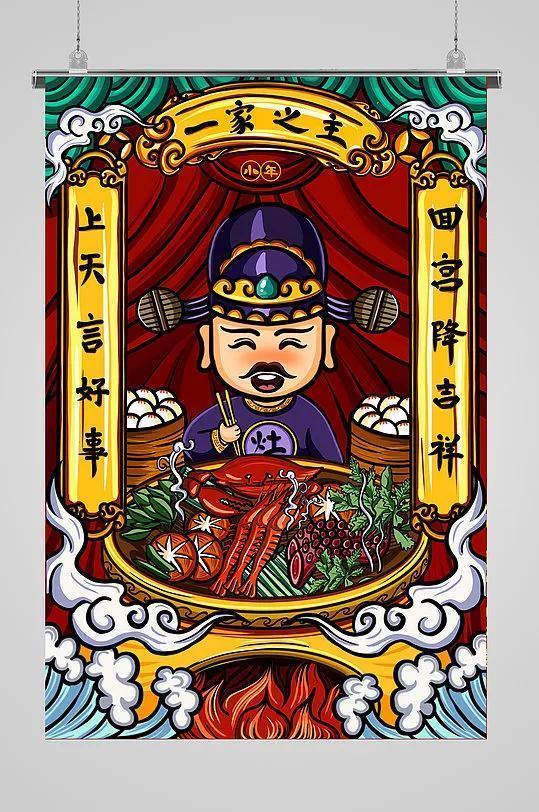 旧俗农历腊月二十三或二十四日这天祭灶,送灶王爷上天(把供奉的灶王画焚化),向玉皇大帝报告他所在的一家在过去一年的表现。为了让灶王爷说好话,要供奉糕、糖、瓜、果之类的供品,送行时还要用糖糊在他的嘴上,让他上天美言好事。到除夕(年三十)再把灶王迎回来,就是请(买)一张新的灶王画(画上画有灶王爷和他的夫人灶王奶奶)供在厨房。画的两侧通常贴一副对联:上天言好事,回宫降吉祥。横批:一家之主。