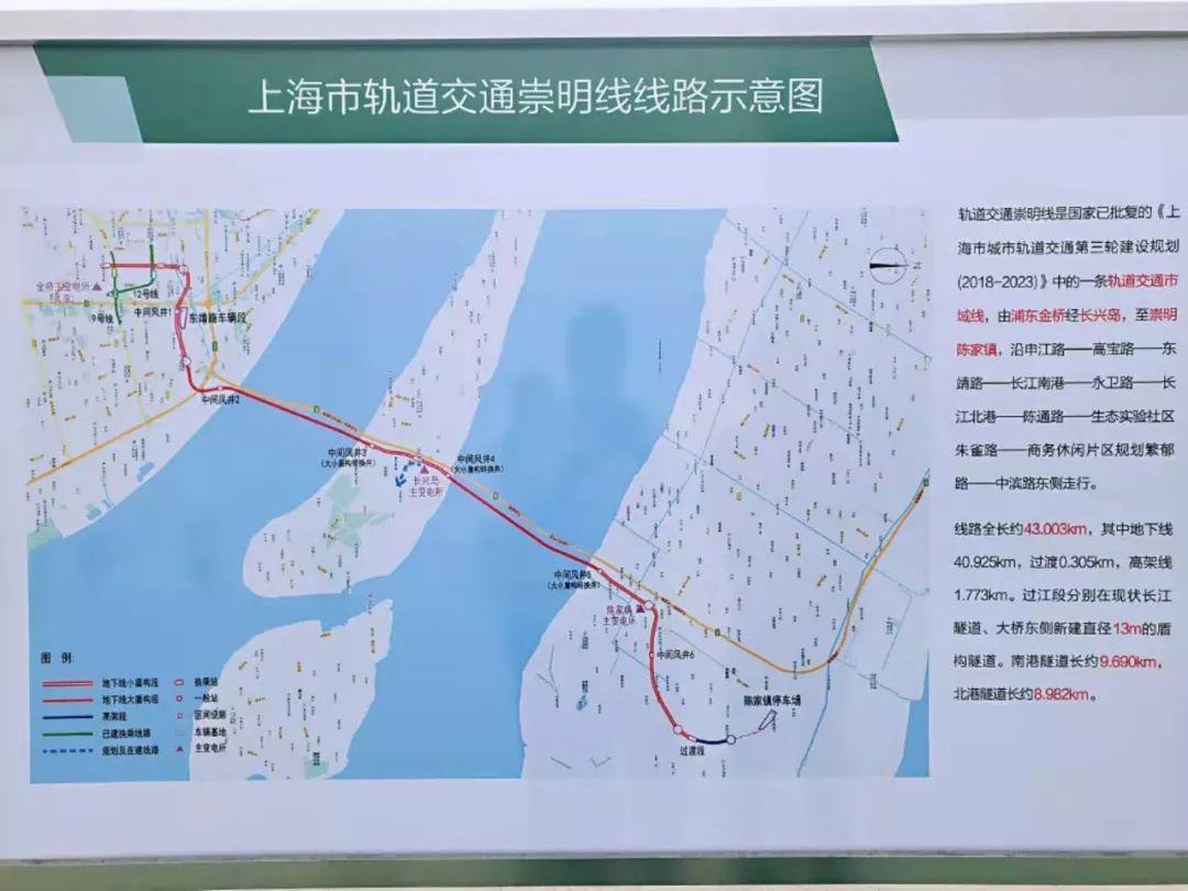 轨交崇明线一条市域线,起于浦东金桥,途经长兴岛,终于崇明陈家镇,线路全长约43km,全线基本为地下车站,根据规划,可在金吉路和申江路车站分别与轨交9号线和12号线实现换乘,以隧道形式两次过长江,设计时速120公里,采用A型车,届时从陈家镇到金桥只要29分钟,通过换乘只需1个多小时就可抵达到人民广场。