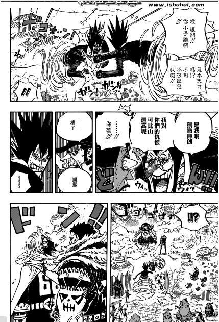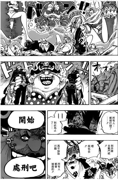 留下的伊治抵不过卡塔库里被吊打,凯撒往战场会跑蓓蕾阻止,勇治尼治也被大妈吊打不成样,草帽联盟军全部被擒拿,大妈宣布对路飞他们执行处刑,贝吉凯撒摇头放弃。突然掉落城堡的玉手箱因为巨大的冲击爆炸,城堡坍塌希望之火再次燃起。