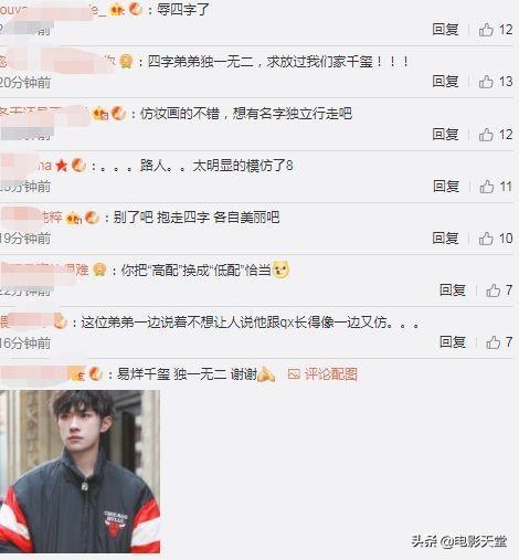 不少网友评论:起码是低配版的易烊千玺吧。不过有粉丝质疑:这分明是在蹭热度啊,这是画了易烊千玺的仿妆?甚至连造型和pose都在刻意模仿易烊千玺,毕竟蹭热度也是走红的方式之一。