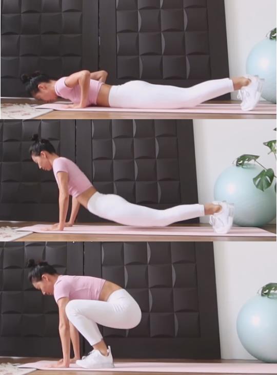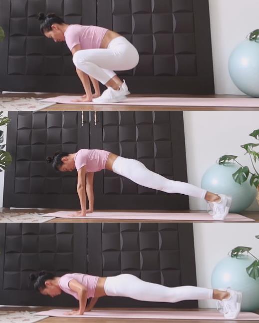 其过程就是主要减掉了俯卧撑,在完成平板支撑后,保持手掌不动,然后有控制的双膝触地,使身体紧贴地面,然后再慢慢的撑起胸部、肚子和膝盖,当身体完全离地后双脚跳回原位。