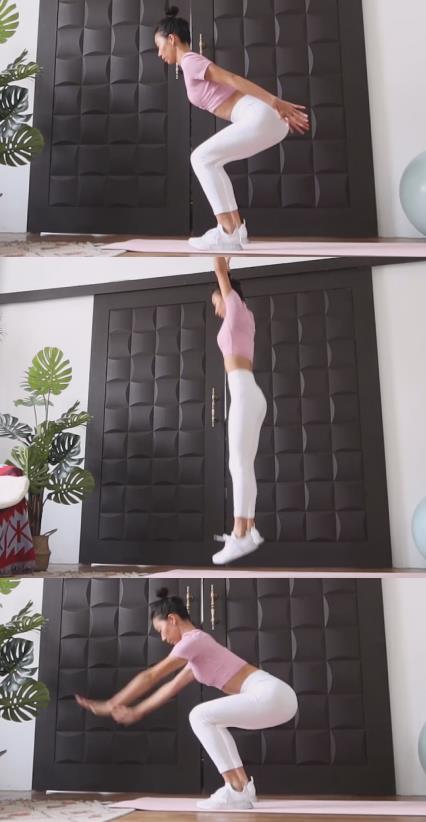当准备体式完成后。就开始第一个动作跳跃,脚尖用力向下蹬地,使身体垂直向上跳跃,脚掌完全离地,然后落回原地完成深蹲,注意膝盖指向第二第三个脚趾头的方向,不要超过脚尖,臀部向后坐。