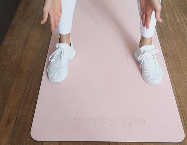 首先我们站在垫子的前端,普通站姿入式,这里注意双脚分开略大于胯宽,保持脚趾和下蹲时的膝盖方向是一致的,缓慢向下至半蹲的动作,膝盖自然稍微指向斜外方。