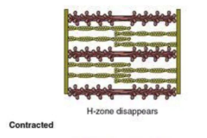 肌肉缩短时,两边的肌动蛋白与中间的肌球蛋白接触的长度最长:
