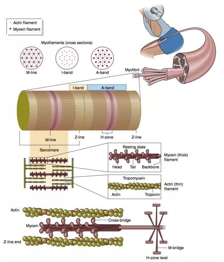 在我们的每块肌肉中,最基础的结构是肌节,每段肌节是由肌球蛋白myosin和肌动蛋白actin构成。