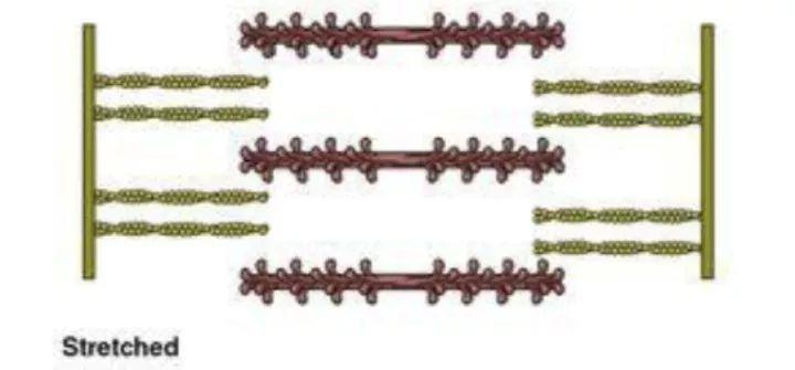 肌肉拉长时,两边的肌动蛋白与中间的肌球蛋白接触的长度最小: