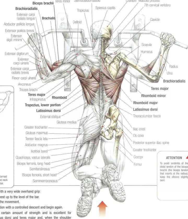4、 引体过程中想象着肩胛骨收紧完成动作,注意力放在背部,想象自己的前臂和手仅仅是钩子,引体过程是尽量把“肘关节往屁股兜里面放”的过程;