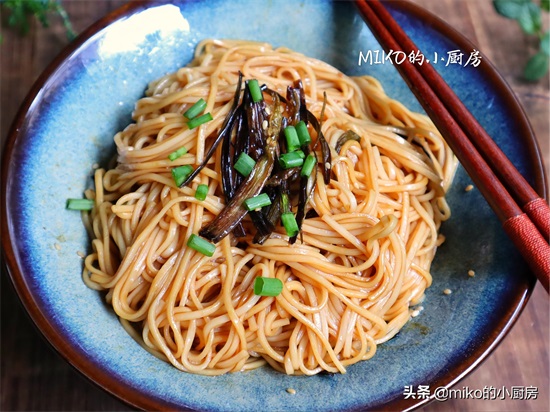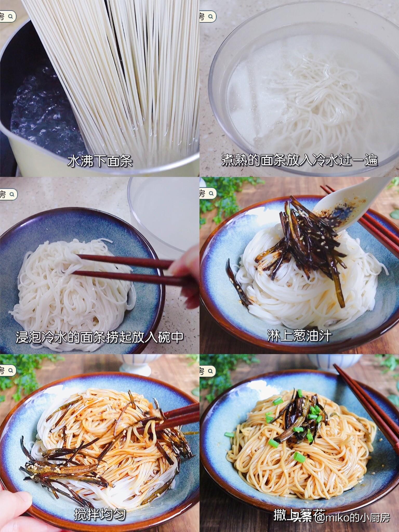 第三步:把葱油汁浇在过好凉水的面条上,充分搅拌均匀,最后撒上葱花即可。