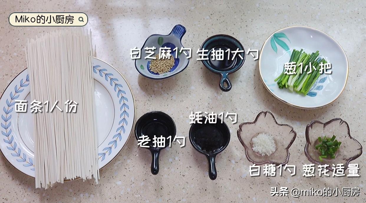面条1人份、小葱5根(切成段)、葱花适量、白芝麻1把、生抽1大勺、老抽1勺、蚝油1勺、白砂糖1勺