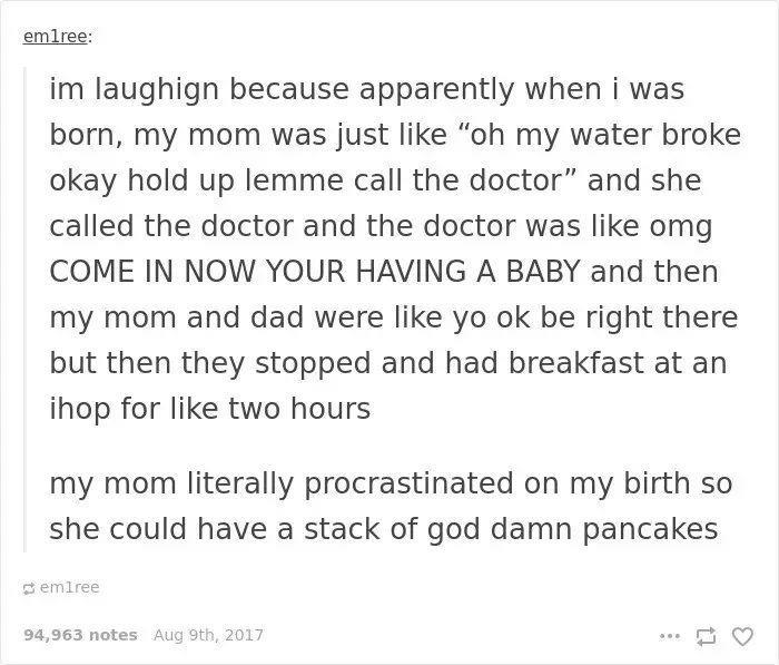 大概意思是:“我出生那天,我妈当时是这样:额,羊水破了。嗯,镇定,让我先打个电话给医生。医生接到电话后,十万火急得说:我的天,你要生了!快点来医院!我妈就说,好的,马上就来。然后,她跟我爸去了一家煎饼店吃早饭,吃了2个小时!吃完后才去生的我……”