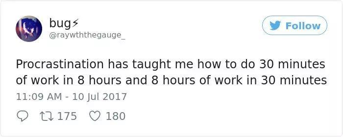 拖延症教会我如何把只要30分钟就能做完的工作做成8个小时。又教会我,如何把原本8个小时才能完成的工作在30分钟之内完成……PS:这话说的没毛病