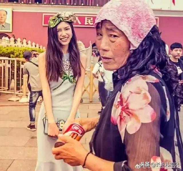 图片上,美丽的模特和憔悴的中国大妈,形成鲜明对比