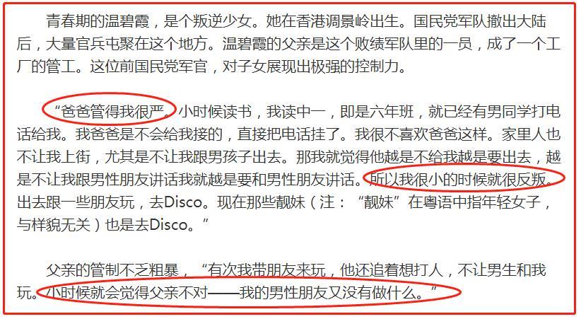 为了防止温碧霞早恋,他的管理越来越严格,据说,在温碧霞上学期间,只要有男同学给她打电话,就会被父亲无情地挂掉,根本不会顾及温碧霞的感受,甚至有男同学到家做客,都会被父亲暴力赶出去。